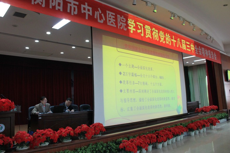開(kāi)啟改革新征程 發(fā)布時(shí)間:2013年12月17日 預(yù)覽:3082次 ——我院舉行學(xué)習(xí)貫徹黨的十八屆三中全會(huì)精神報(bào)告會(huì) 為深入學(xué)習(xí)貫徹黨的十八屆三中全會(huì)精神,12月14日上午,一場(chǎng)精彩的宣講報(bào)告會(huì)在我院門(mén)診綜合大樓21樓大會(huì)議室隆重舉行。報(bào)告會(huì)特別邀請(qǐng)了衡陽(yáng)市委黨校劉景良教授前來(lái)宣講。院黨委書(shū)記申惠龍主持大會(huì),全體中層以上干部及在職黨員近400名同志聆聽(tīng)了報(bào)告。 劉景良教授對(duì)黨的十八屆三中全會(huì)精神進(jìn)行了深入解讀,他運(yùn)用鮮活的語(yǔ)言、豐富的實(shí)例系統(tǒng)闡述了全面深化改革的重大意義、指導(dǎo)思想和實(shí)質(zhì)要義,尤其對(duì)于在改革的道路上如何“涉險(xiǎn)灘”、“啃硬骨頭”、“破瓶頸”等問(wèn)題提出了獨(dú)到的見(jiàn)解。同時(shí),報(bào)告緊貼醫(yī)療衛(wèi)生改革實(shí)際,既有理論高度、思想深度,又具備很強(qiáng)的針對(duì)性和指導(dǎo)性。 黨委書(shū)記申惠龍強(qiáng)調(diào),全院干部職工會(huì)后要繼續(xù)深入學(xué)習(xí)、細(xì)心揣摩、深刻領(lǐng)悟,全面把握全會(huì)基本精神和重點(diǎn)內(nèi)容,用改革的精神、創(chuàng)新的理念、市場(chǎng)的意識(shí)和為民的宗旨來(lái)指導(dǎo)醫(yī)療實(shí)踐,在全院掀起學(xué)習(xí)貫徹黨的十八屆三中全會(huì)精神的熱潮。 會(huì)議最后,院長(zhǎng)申錦林發(fā)表了重要講話(huà)。他要求全院各部門(mén)、各科室要高度重視,學(xué)深、吃透全會(huì)精神,在思想上和行動(dòng)上同黨中央保持高度的一致,爭(zhēng)當(dāng)改革的促進(jìn)者,推動(dòng)醫(yī)院全面、快速向前發(fā)展。 (王穎超)