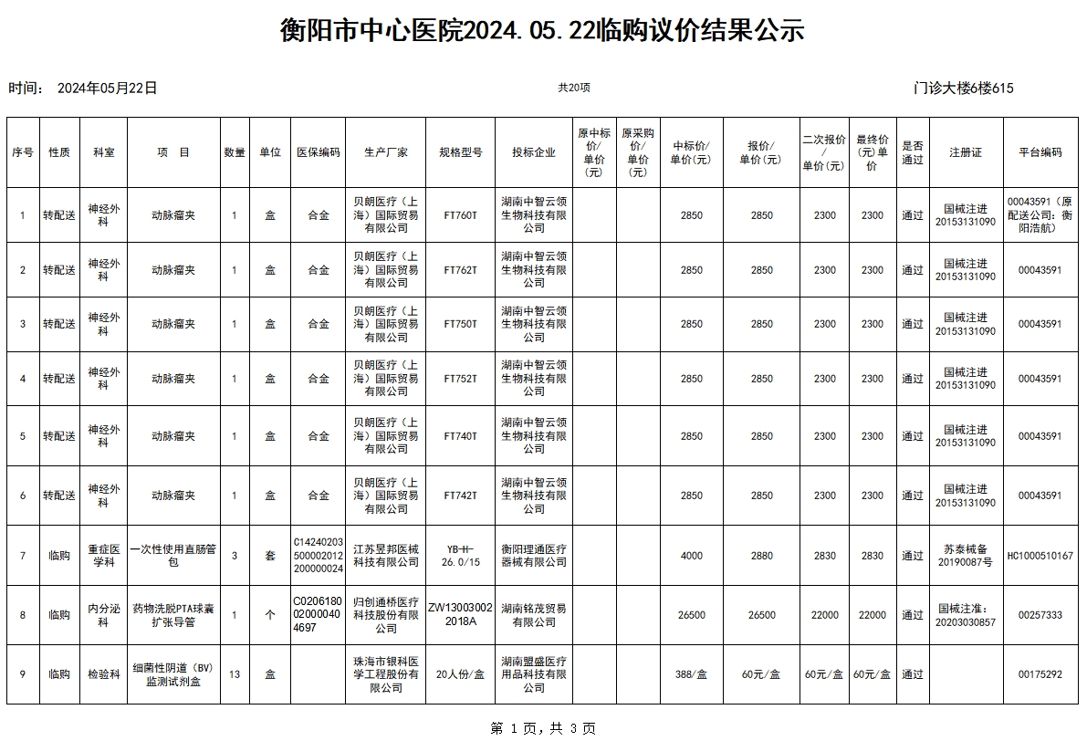 衡陽市中心醫(yī)院2024.05.22臨購議價(jià)結(jié)果公示