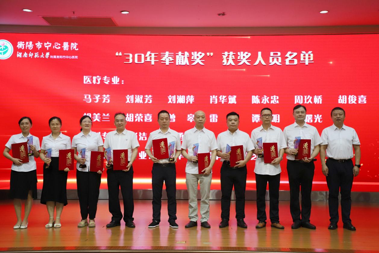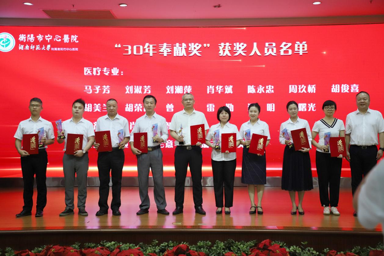 馬子芳、劉淑芳、劉湘萍、肖華斌、陳永忠、周玖橋、胡俊喜、胡美蘭、胡榮喜、曾皋、雷勤、譚明、譚曙光、肖潔、賓智勇、毛意華、楊瑞豐、唐靈芝榮獲“30年奉獻獎”。黨委書記申惠龍、院長尹軍分別為工作滿30年的醫(yī)療專家、藥學(xué)、檢驗專家人員頒發(fā)榮譽證書和“30年奉獻”獎杯。