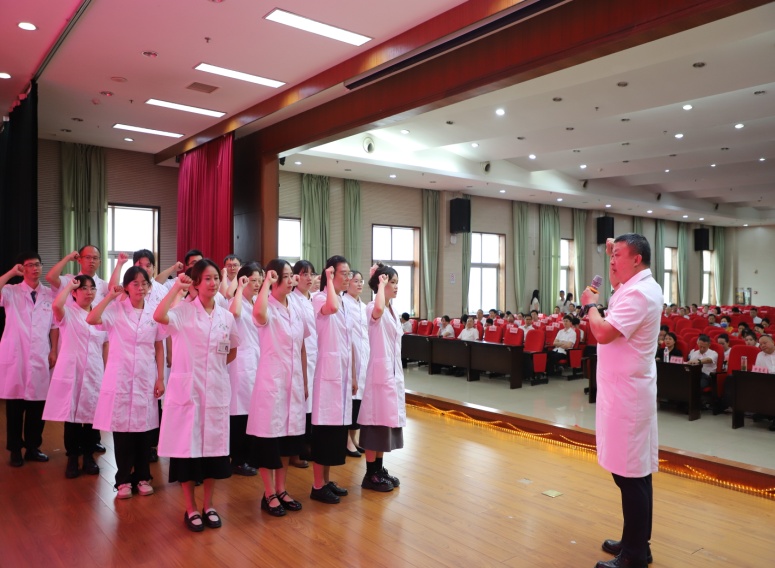 現(xiàn)場,尹軍帶領(lǐng)在場的醫(yī)務(wù)人員重溫了中國醫(yī)師宣誓誓詞,承諾將一如既往維護醫(yī)學(xué)的尊嚴(yán)和神圣,敬佑生命,患者至上,努力擔(dān)當(dāng)增進人類健康的崇高職責(zé)。