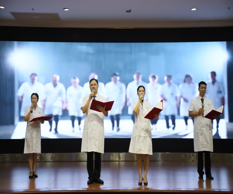 體檢中心主任、從醫(yī)“30年奉獻”獎獲得者楊瑞豐等4人帶來的詩朗誦《永恒的誓言》,四位醫(yī)生用飽含深情的語言,展示了醫(yī)生堅守初心使命、攜手抗擊病魔、勇攀醫(yī)學(xué)高峰的奮斗畫面。