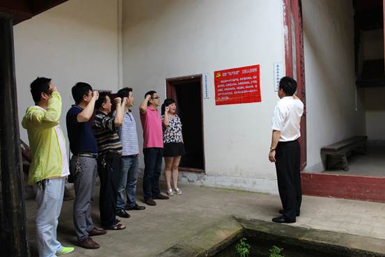 義診結(jié)束后,大家又轉(zhuǎn)道衡山縣白果村參觀了黨的紅色教育基地——岳北農(nóng)工會舊址。從展覽中得知,1923年這里成為中國革命史上全國第三個(gè)、湖南第一個(gè)農(nóng)會組織,以及毛澤東同志1926年考察農(nóng)民運(yùn)動時(shí)白果婦女鬧祠堂、求解放的事跡。在這里,副院長黃志堅(jiān)帶領(lǐng)大家舉行了重溫黨的誓詞活動。