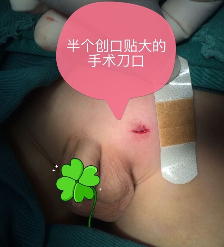 而在兒童疝方面,更以其微小的手術(shù)切口,與小兒腹腔鏡疝手術(shù)相媲美。此外,我院還擁有譚滇湘主任帶領(lǐng)的小兒麻醉團(tuán)隊,確保麻醉更安全??剖夷壳霸\治的兒童疝,除合并鞘膜積液及嵌頓疝外,手術(shù)切口均在1cm左右。為了減少小孩長大后手術(shù)疤痕的心理創(chuàng)傷,我們采取經(jīng)皮紋橫切口,絕大部分手術(shù)切口均只有幾毫米(見下圖),手術(shù)采用美容縫合,不需拆線,術(shù)后麻醉清醒即可進(jìn)食,術(shù)后第二天就可出院。