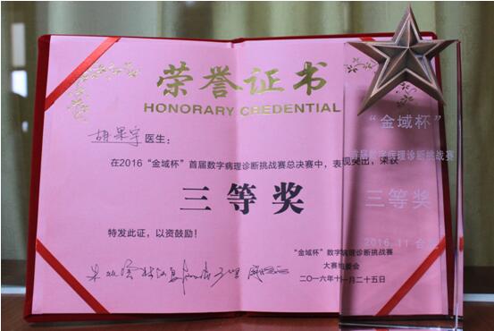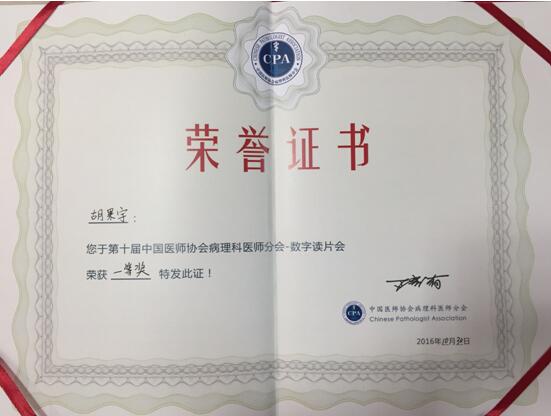 胡果宇榮獲第十屆中國(guó)病理醫(yī)師年會(huì)數(shù)字讀片比賽一等獎(jiǎng) 發(fā)布時(shí)間:2016年12月1日 預(yù)覽:2547次 近日,第十屆中國(guó)病理醫(yī)師年會(huì)上傳來喜訊,我院病理科副主任胡果宇榮獲中國(guó)醫(yī)師協(xié)會(huì)病理醫(yī)師分會(huì)數(shù)字讀片會(huì)比賽一等獎(jiǎng)。2016“金域杯”首屆數(shù)字病理診斷挑戰(zhàn)賽上,胡果宇又以華中賽區(qū)第一名的好成績(jī)?nèi)雵珖?guó)六強(qiáng)。11月25日,經(jīng)過激烈角逐,胡果宇最終在總決賽上榮獲了三等獎(jiǎng)。 據(jù)悉,胡果宇副主任醫(yī)師從事臨床病理診斷近十年,具有扎實(shí)的基本功和敏銳的觀察力,主要在組織學(xué)、細(xì)胞學(xué)病理尤其是腫瘤病理的診斷上頗有所長(zhǎng)。 (王穎超)