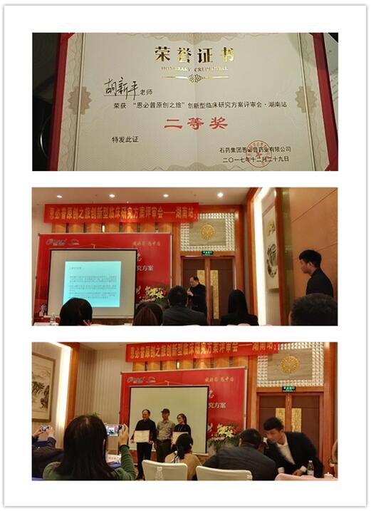 神內(nèi)科胡新平主任喜獲“恩必普原創(chuàng)之旅”創(chuàng)新型臨床研究方案評審會二等獎 發(fā)布時間:2018年1月5日 預(yù)覽:2248次 通訊員劉立君報道: 12月29號,在長沙舉辦的“恩必普原創(chuàng)之旅”創(chuàng)新型臨床研究方案評審會上,我院神內(nèi)科胡新平主任以《丁苯酞聯(lián)合高壓氧對急性缺血性腦卒中側(cè)支循環(huán)的作用研究》為課題,經(jīng)過演講、匯報、專家評審等環(huán)節(jié)綜合評比,最終脫穎而出,喜獲二等獎。 此次評審會參賽專家共計13人,分別來自中南大學(xué)湘雅醫(yī)院、湖南省人民醫(yī)院、長沙市第一醫(yī)院、南華大學(xué)附屬第一醫(yī)院等省內(nèi)大型醫(yī)院,課題主要圍繞藥物丁苯酞對腦卒中的治療作用進行研究。評審專家由中南大學(xué)湘雅醫(yī)院的肖波教授、楊曉蘇教授,中南大學(xué)湘雅二醫(yī)院的胡治平教授、中南大學(xué)湘雅三醫(yī)院的宋治教授、湖南省第二人民醫(yī)院的楊松林教授等湖南省神經(jīng)內(nèi)科領(lǐng)域具有重要影響力的教授組成。胡新平主任在評審會現(xiàn)場,對自己的課題《丁苯酞聯(lián)合高壓氧對急性缺血性腦卒中側(cè)支循環(huán)的作用研究》進行了精彩匯報,經(jīng)過專家的認真遴選,榮獲了二等獎。 “恩必普原創(chuàng)之旅”是為探索腦卒中治療臨床研究中的新方向,提高腦卒中的治療水平,促進中國創(chuàng)新型中青年醫(yī)生的成長,由恩必普藥業(yè)公司支持和開展的一項中國原創(chuàng)藥物創(chuàng)新性臨床研究方案征集活動。 胡新平主任的課題《丁苯酞聯(lián)合高壓氧對急性缺血性腦卒中側(cè)支循環(huán)的作用研究》在創(chuàng)新臨床研究方案評審會上的獲獎,將進一步激發(fā)我院廣大醫(yī)務(wù)人員在科研方面的熱情和興趣,提高我院在湖南省神經(jīng)內(nèi)科領(lǐng)域的影響力。