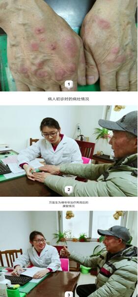 11月9日這天我來到中心醫(yī)院門診皮膚科見到一位很年輕的女醫(yī)生,認(rèn)為年輕醫(yī)生經(jīng)驗(yàn)不足、見識(shí)不多,頓時(shí)我求醫(yī)的心跌至谷底,然而這位醫(yī)生卻出乎意料之外,她隨即叫我伸出雙手仔細(xì)觀察病灶、認(rèn)真診治并用手機(jī)拍了個(gè)發(fā)病的病灶,胸有成竹的診斷我的病為“多形紅斑”,并告知了該病的后果嚴(yán)重性。經(jīng)她精心的治療及第二次復(fù)診使用的內(nèi)服、外用藥一星期多基本控制了病情,兩周后徹底痊愈。幸運(yùn)這次遇上了年輕有為的萬醫(yī)生,才使我脫離了疾病的折磨和痛苦。