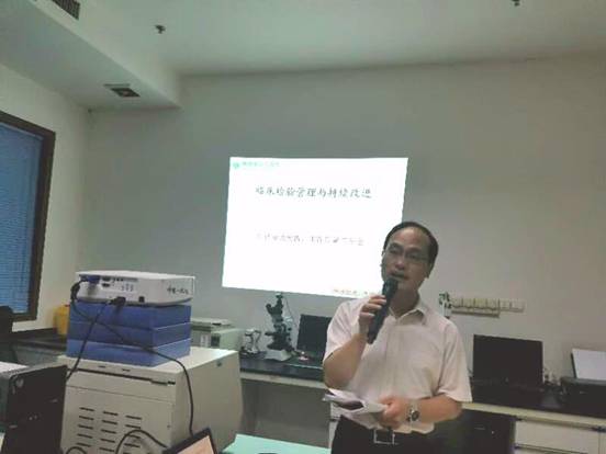 卿文衡主任做了題目為“臨床檢驗(yàn)管理與持續(xù)改進(jìn)”的講課,以評(píng)審為契機(jī),重在質(zhì)量與安全,提出“每個(gè)員工都是管理者,管好自己,管好別人?!保⒃敿?xì)講解了“PDCA循環(huán)”的管理方式,及檢驗(yàn)科6S日常管理策略,臨床檢驗(yàn)管理與持續(xù)改進(jìn)方案。