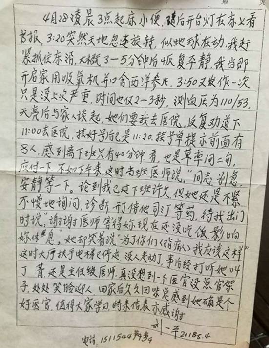 一封老人的感謝信 發(fā)布時(shí)間:2018年5月4日 預(yù)覽:11216次 5月4日上午,一位退休老人步履艱難地來到門診辦公室,述說了他前幾天來門診看病的感動(dòng)。他遞上感謝信后一再叮囑要求門診負(fù)責(zé)人給予表揚(yáng),述說時(shí)還熱淚盈眶。下面老人家寫給神經(jīng)內(nèi)科門診醫(yī)師丁菁主任的信: 劉一平老人不辭辛苦,病情好轉(zhuǎn)后特地趕來醫(yī)院門診向4月28日看門診的丁菁主任表示感謝。
