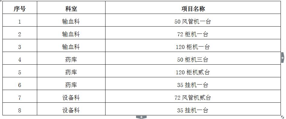 zxyy20180022招標(biāo)公告空調(diào)12臺(tái) 發(fā)布時(shí)間:2018年5月16日 預(yù)覽:3723次 因醫(yī)院發(fā)展的需要,我院擬于近期院內(nèi)招標(biāo)采購(gòu)一批空調(diào),歡迎具備條件的公司報(bào)名參加。一、采購(gòu)項(xiàng)目編號(hào)及產(chǎn)品名稱(一)采購(gòu)項(xiàng)目編號(hào):zxyy20180022(二)產(chǎn)品名稱詳見下表:二、報(bào)名時(shí)間:2018年5月16日至2018年5月21日請(qǐng)有意向參加投標(biāo)的公司于2018年5月16日至2018年5月21日下午5時(shí)前到采購(gòu)中心(門診綜合大樓六樓)遞交報(bào)名資料(投標(biāo)人公司工商執(zhí)照)并領(lǐng)取招標(biāo)文件。三、遞交報(bào)價(jià)截止日期:2018年5月25日下午5點(diǎn)(價(jià)格單獨(dú)密封,空調(diào)價(jià)格及配件價(jià)格單獨(dú)報(bào)單價(jià))四、聯(lián)系方式:聯(lián)系地址:衡陽(yáng)市雁城路10號(hào)聯(lián)系人:曾老師、王老師聯(lián)系電話:0734-8275875傳真號(hào)碼:0734-8275875電子郵箱:cgzx875@163.com 衡陽(yáng)市中心醫(yī)院2018年5月16日