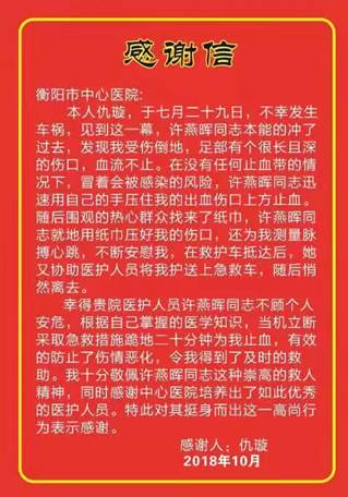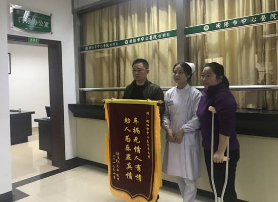 做好事后沒(méi)留名,聞?dòng)嶅\旗送上門 發(fā)布時(shí)間:2018年10月26日 11:47:30 預(yù)覽:2299次 通訊員張永明報(bào)道:10月25日,門診辦公室意外收到一面錦旗和感謝信。事后了解得知是三個(gè)月前發(fā)生的一件隱姓埋名做好事感人的事情。 7月29日星期天上午,袁俊杰、仇璇兩夫妻帶著小孩騎摩托車從香格里拉小區(qū)出來(lái),途中不幸被急馳的小車掛傷,造成左足跟部撕裂傷約16cm,流血不止。被巧遇從此路過(guò)的護(hù)士許燕暉看到和聽(tīng)到呻吟聲,她迅速走近傷者面前,并及時(shí)讓旁邊人呼叫120,當(dāng)天上午近11點(diǎn)鐘,烈日當(dāng)空的地上滾燙,她依然穿著短裙赤腳跪在熱地板上20多分鐘不顧被傷者流血感染徒手壓著傷口上方止血,同時(shí)又測(cè)量傷者脈搏心跳,觀察面色有無(wú)異常,還不斷地安慰傷者,等120救扶車趕到才悄然離開(kāi)。后經(jīng)傷者方多方打聽(tīng)才得到基本線索,許燕暉認(rèn)為自己只是做了一件很平常的事,所以一直隱姓埋名三個(gè)月里從沒(méi)有言說(shuō)。之后,傷者仇璇的愛(ài)人袁俊杰送病人到衡陽(yáng)市中心醫(yī)院看病,在門診大廳無(wú)意間碰到了許燕暉,感覺(jué)面熟,最后從側(cè)面才得知確切的信息。10月25日,袁俊杰護(hù)著已經(jīng)出院多日但還沒(méi)有痊愈仍柱著拐杖的妻子前來(lái)衡陽(yáng)市中心醫(yī)院門診辦公室送上錦旗和感謝信,以表真誠(chéng)的感恩。許燕暉,雖然來(lái)衡陽(yáng)市中心醫(yī)院門診部工作近一年,平常工作積極主動(dòng),微笑服務(wù),早出晚歸,樂(lè)于幫助病人,多次拾金不昧,應(yīng)對(duì)突發(fā)事件處置能力強(qiáng),溝通能力好,深受大家好評(píng)。