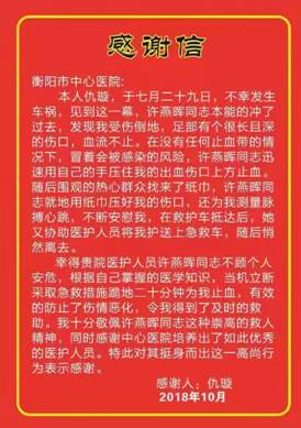 10月25日上午,當(dāng)袁俊杰攙扶著柱著拐杖還未痊愈的妻子前來衡陽市中心醫(yī)院門診辦公室送上錦旗和感謝信,這件感人的好事也浮出了水面,許燕暉面對前來感謝的袁俊杰、仇璇夫妻時,表現(xiàn)出一名95后女生的羞澀,不好意思地表示“我是護(hù)士,救人就是我的職責(zé)!”。