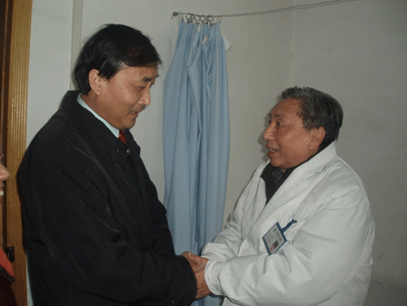 當(dāng)天下午,徐明華來到我院門診部二樓胸外科診室,陳業(yè)煌正在接診一名病人。徐明華親切地握著陳業(yè)煌的手說:“春節(jié)將至,我代表市委、市政府來看望您了,向您表示誠摯的問候?!苯又烀魅A細(xì)心地問起了陳業(yè)煌的從醫(yī)經(jīng)歷及家庭狀況,當(dāng)?shù)弥悩I(yè)煌已從事醫(yī)療工作51年,接診病人無數(shù),71歲的高齡仍堅(jiān)持看門診,在病人心目中享有盛譽(yù)等事跡后,他對(duì)陳業(yè)煌給予了高度評(píng)價(jià),稱他“醫(yī)術(shù)高明,醫(yī)德高尚,是醫(yī)務(wù)人員的楷模?!?/P>