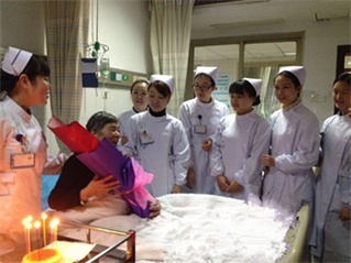 第二個(gè)故事發(fā)生在去年12月,80歲的汪奶奶因膽總管結(jié)石疼痛得厲害,被送到衡陽市中心醫(yī)院肝膽外科住院治療。12月10日是汪奶奶的80歲生日,上午9時(shí),肝膽外科的護(hù)士們的白衣天使們捧著生日蛋糕和一束康乃馨,唱著歡快的生日快樂歌走到了她的床邊,“奶奶,今天是您的生日,我們給您祝壽來了!”護(hù)士長許敏帶領(lǐng)全體護(hù)士姐妹們齊聲為老人送上了飽含祝福的吉祥話,祝愿老人健康長壽。在生日蠟燭的燭光下,奶奶露出了溫暖而又真摯的笑容,老人說這是她有生之年過得最開心的一個(gè)生日。現(xiàn)場濃厚和溫馨的場面,不僅讓汪奶奶特別激動(dòng),就連其家人和同病房的病友也感動(dòng)地流下了熱淚。